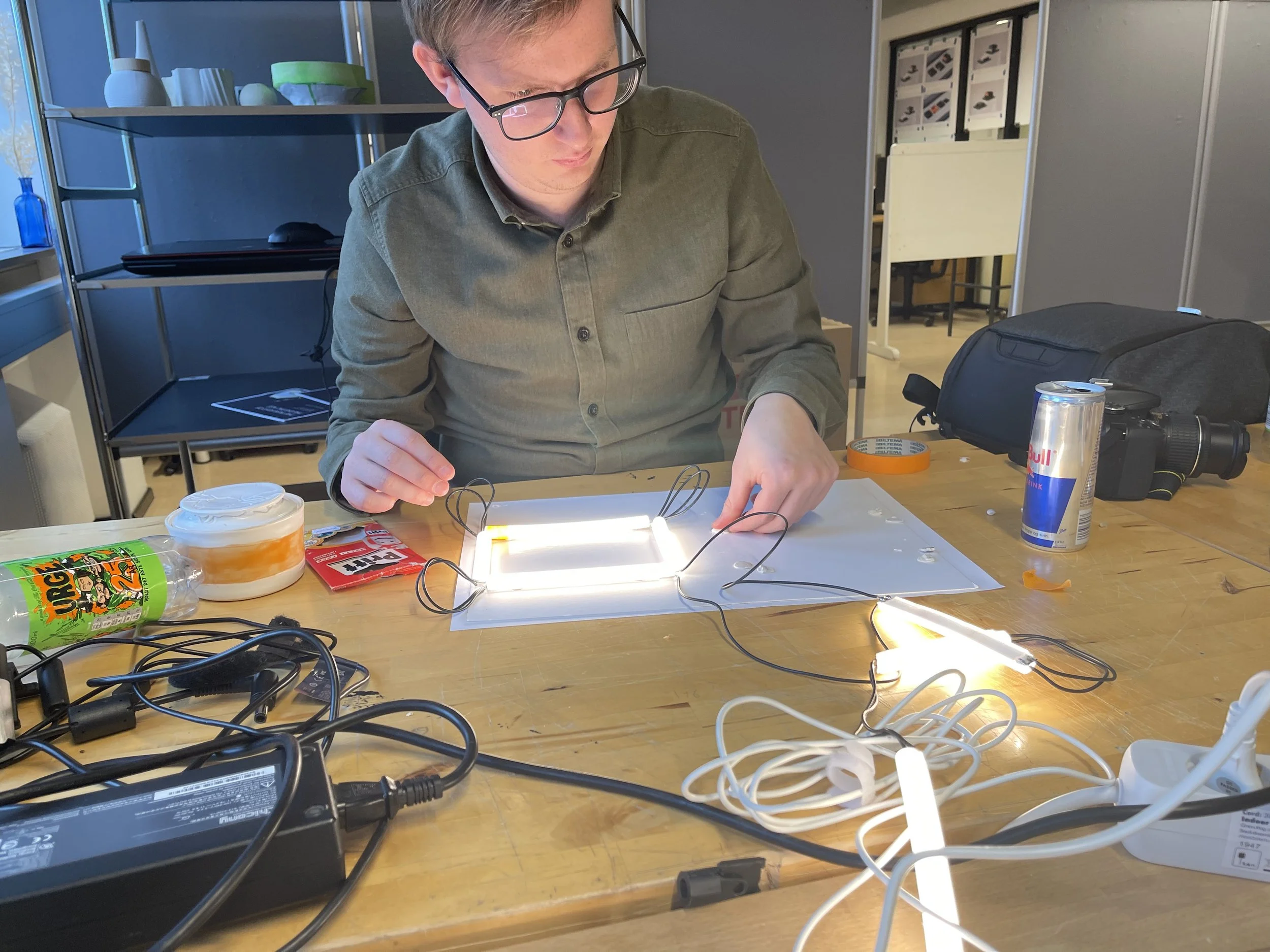 Eksperimentering med mockups og refleksjonslys for å finne optimal spredning og komfort.