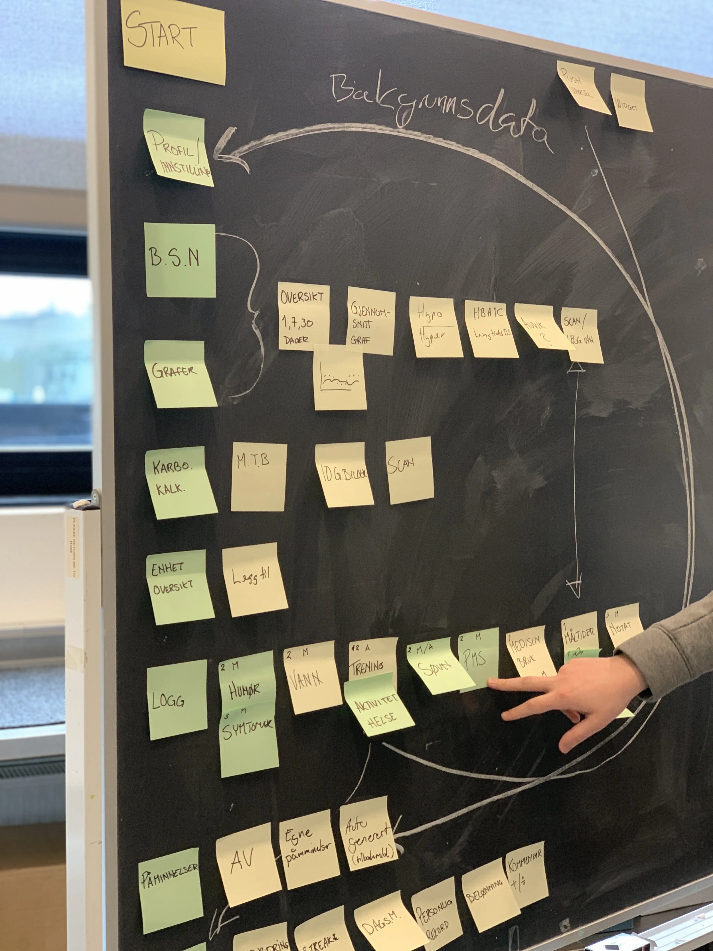 Vi jobbet brukersentrert gjennom hele prosjektet, med dybdeintervjuer, spørreundersøkelser og brukertester. For å forstå hverdagen til diabetikere, prøvde vi selv å måle blodsukker over tid. Vi brukte metoder som personas, brukerreiser og prototyping, og utviklet konseptene i flere iterasjoner med løpende tilbakemeldinger fra brukere